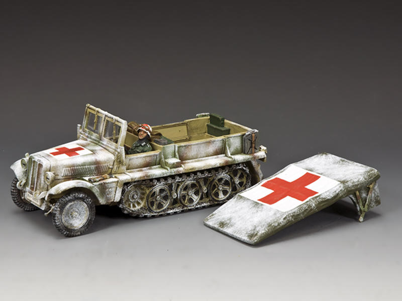 The Sd.Kfz.10 (Sonderkraftfahrzeug or Special Motorized Vehicle) was a WW2 half-track that saw widespread use in all German Theatres of Operations. Its main role was as a prime mover of smaller towed artillery pieces however it could also carry up to 8 infantry troops. Among its many other uses this vehicle was a ‘battlefield ambulance .’ It had excellent cross country capabilities that allowed it to get right up to the frontlines and help evacuate wounded soldiers back to base hospitals and first aid posts. Our K&C model has had its original summer camouflage painted over with a coat of winter ‘whitewash’ by its crew but is already showing ‘wear and tear’ through the vehicles constant use in difficult cold weather conditions. The model includes a seated driver and a removable ‘canvas’ cover.